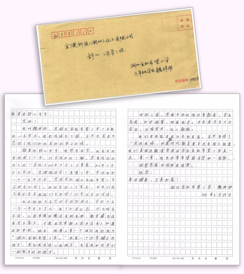 “舒心爷爷,我的成绩也不错,当然也是因为您给了我们如此良好的学习环境……‘湖北金虹希望小学’,是让我有信心的地方,也是我和同学们一起努力的地方……我们真诚的邀请您能回您的金虹希望小学走一走,看一看,我也非常希望能同您合一张影……”朴实的文字、真挚的情感,表达了孩子们对舒心主席深深的感恩与祝福。