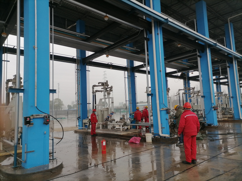 维修党支部委员、维修车间主任李辉,加氢车间副主任马自勇,设备机动处科员陈望现场监护加氢装置新氢压缩机A注油器更换工作。
