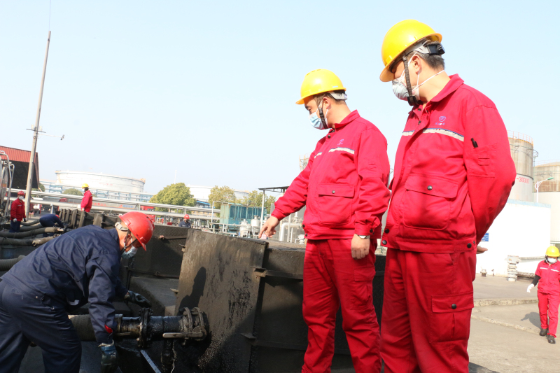 油品车间班员刘炎辉、物流公司班员熊才广在卸油场对原料车卸油进行监护,确保原油安全入库。