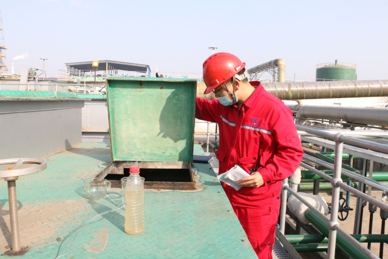 能源车间副主任王忠仁,在污水处理场1#汽浮池出水口检查,观察水质颜色,确保出水水质合格。