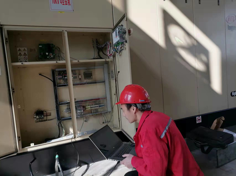 党员、设备维修公司电工车间副主任李云辉对能源车间4#空压机LOGO故障进行检查处理。