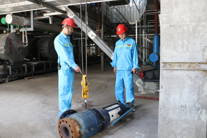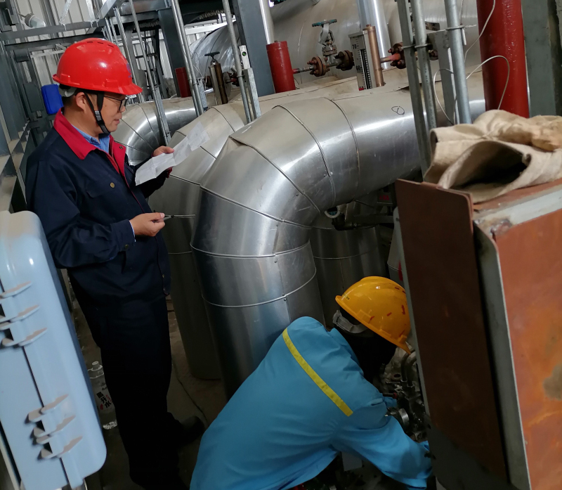 维修党支部委员、副总经理王雄军与仪表车间主操杨康对3号锅炉汽包水位计进行检修,并现场进行监护指导。