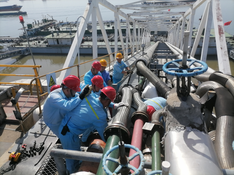 物流公司副总经理谢胜良组织油库管理员及当班员工对码头箱变处原油管线DN300金属软管进行更换。