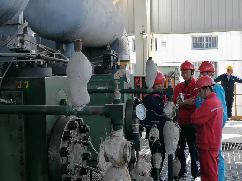 党员、总裁助理郑经友,维修党支部书记、总经理王直山,支部委员、维修车间主任李辉,党员、维修车间副主任肖生运现场商讨并制定改质新氢压缩机缸盖螺栓故障检修方案。