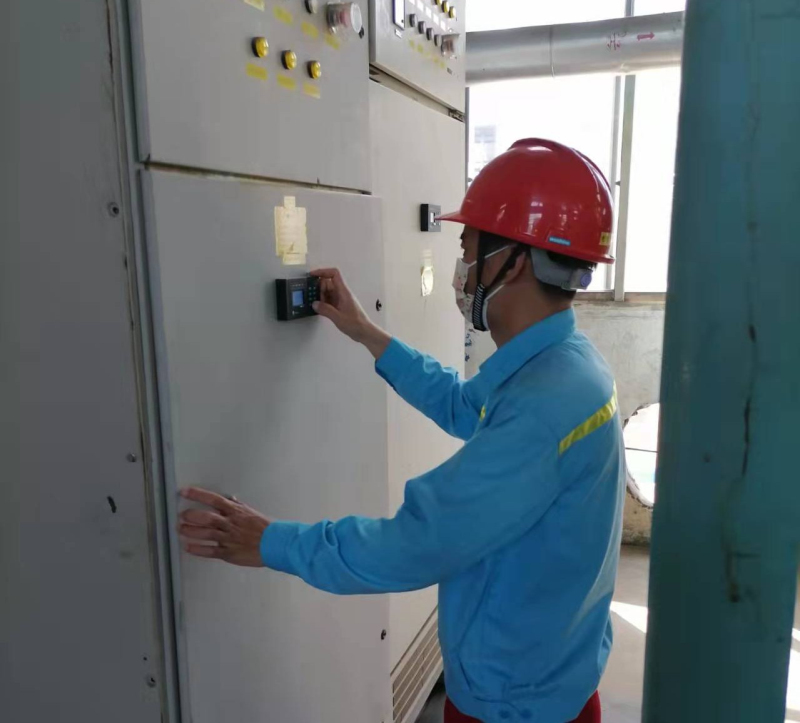 党员、电工车间副主任李云辉检查氮气站空压机运行参数,了解设备运行状况。