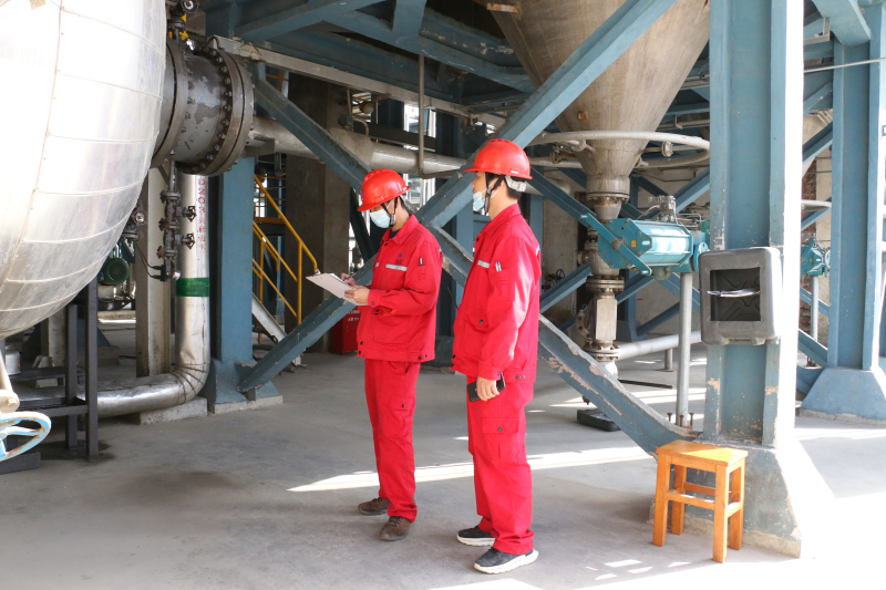 化工党支部委员、副总经理陈波,聚丙烯车间管理员关江江检查卧釜尾轴防范措施落实执行情况。