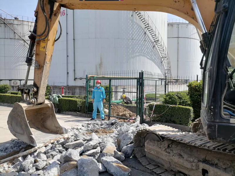 储运党支部书记、油品储运一公司总经理张大立在油品车间中间罐区现场监护消防水管更换基础开挖,确保施工安全。
