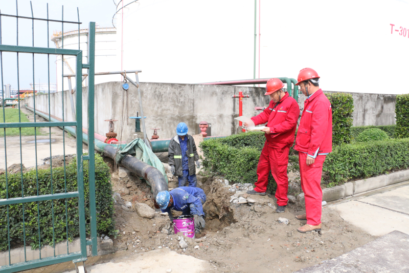 储运党支部书记、油品储运一公司总经理张大立,党员、油品车间副主任张小平对消防水管线防腐施工进行安全监护。