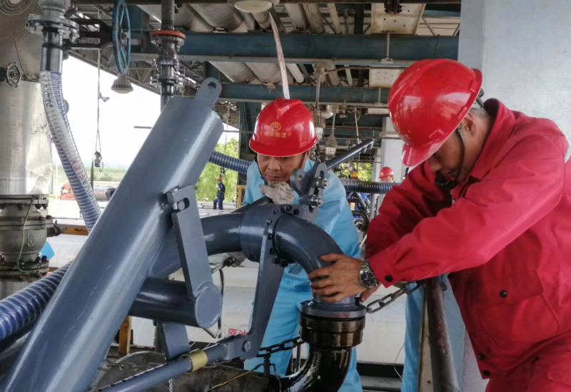 物流公司设备管理员张海红,趸船管理员董刚山对油库发油平台鹤管唇形圈进行更换。