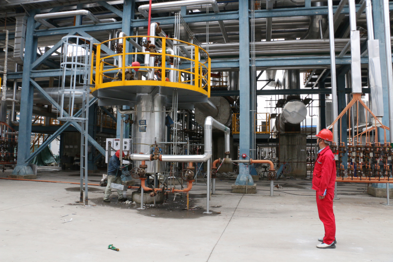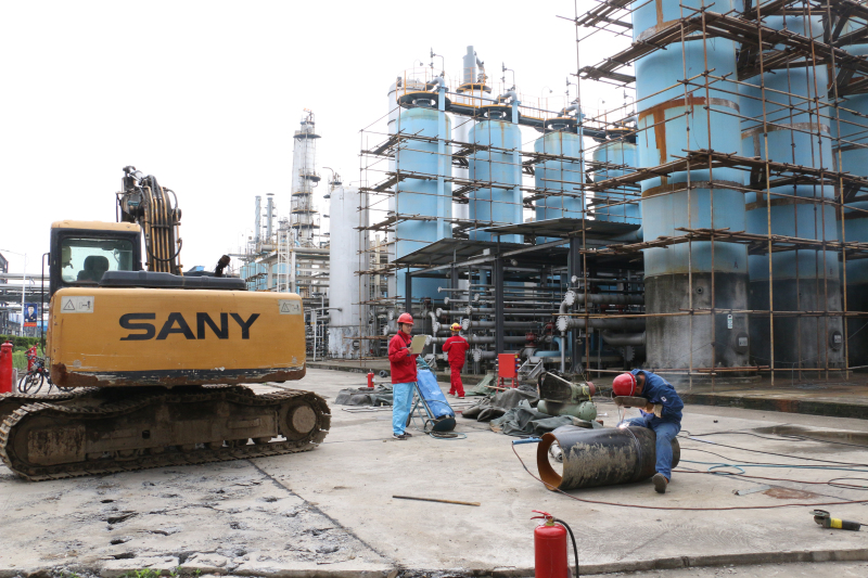 炼化党支部委员、副总经理乐德俊在新硫磺装置现场对防腐保温施工进行安全监护。