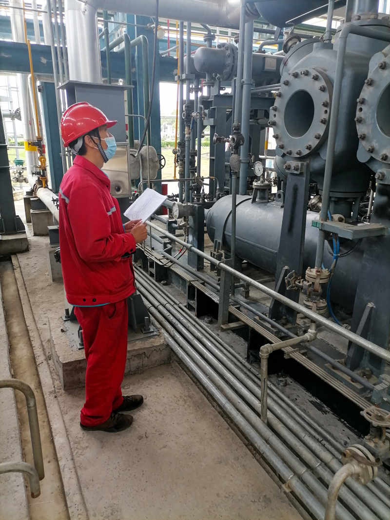 化工党支部委员、副总经理陈波检查聚丙烯装置往复式压缩机C303运行情况及班组巡查质量。